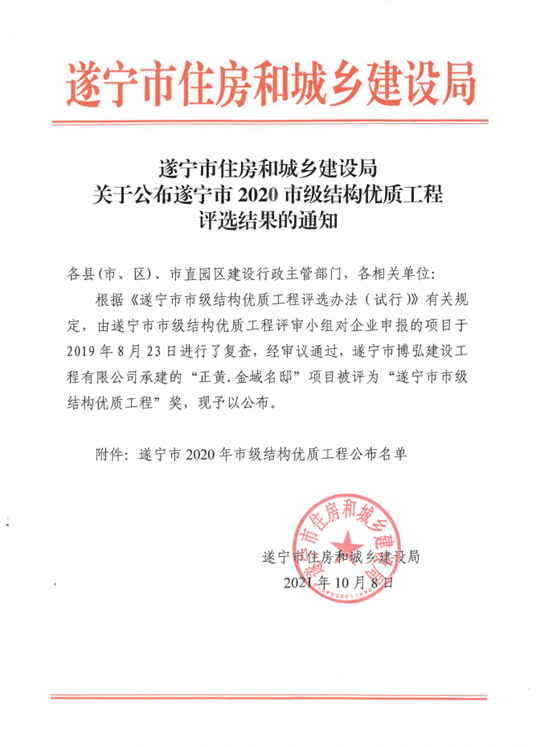 恭喜遂寧“正黃·金域名邸”項目被評為“遂寧市2020市級結構優質工程”獎稱號。